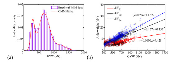 The V6 trucks were selected as a prototype to investigate the probability of vehicle loads. Figure 9a shows histograms of the distribution of monitored empirical gross vehicle weights (GVWs). They were fitted using a Gaussian mixture model (GMM) that is a combination of several Gaussian distributions. The two peaks of the PDF in Figure 9a represent the normal and overloaded trucks. It can be observed that the GVW followed a multimodal distribution, where the truck overloading effect was captured by the probabilistic model. Figure 9b plots the relationship between axle weight (AW) and GVW, where the star, circle, and plus symbols represent the weights of the first, second, and fifth axle, respectively, and AWij represents the AW of the j-th axle of the i-th type of vehicles. It is observed that the AW and GVW were almost linearly dependent.