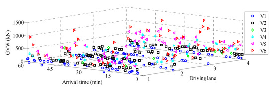 Based on the estimated probability distribution models, a stochastic traffic load model was developed using MCS. Figure 10 plots the simulated dense traffic flow model, where each vehicle was simulated as a label. The stochastic traffic load model contained the parameters of vehicle type, GVW, driving lane, and vehicle spacing.