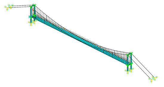 Girders and pylons were modeled with Beam188 elements, and the main cables and girders were modeled with Lin180 elements. The main cable and the pylon were connected with coupled degrees of freedom, while the bottom parts were fully constrained. The initial tension forces in the main cable and suspenders were introduced as pre-stressed tension.