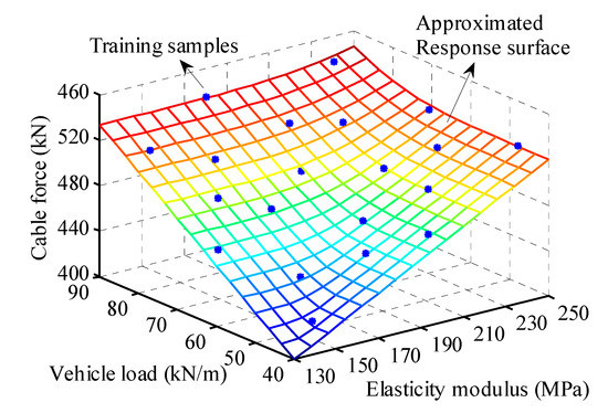 Using the FE model, the structural response can be approximated through the DBN. Initially, 20 uniformly-distributed training samples were selected as the input data. Corresponding structural response including cable forces and bending moments, were computed using the FE model and were used as the output data. The DBN was treated following the framework presented in Figure 3. As an example, the approximated cable force is presented in Figure 12. It can be observed that the response surface has captured the nonlinearity of structural mechanics.