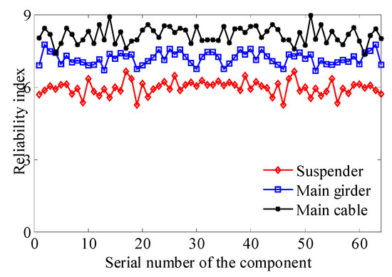 In general, there are three types of failure modes related to bridge components: suspender fracture, main cable rupture, and girder bending moment failure. The reliability index of each bridge component is shown in Figure 13.