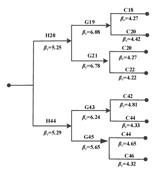 According to the first failure searching procedure, the components that are likely to fail were H20 and H44. Since the failure mode of suspenders is brittle failure, the failed cable should be directly removed from the structural system. Subsequently, the structural system was updated and approximated by the DBNs. At the second stage, the components that were likely to fail were stiffening girders associated with G19, G21, G43, and G45. Since the failure mode of girders is plastic failure, a hinge should be added at the node between two girder elements. At the third failure stage, the main cable is the most likely to fail component associated with C18, C20, C22, C42, C44, and C46. Consequently, the three-level fault tree of the bridge structural system is constructed, as shown in Figure 14, where βc is the conditional reliability index of the component corresponding to each failure stage.