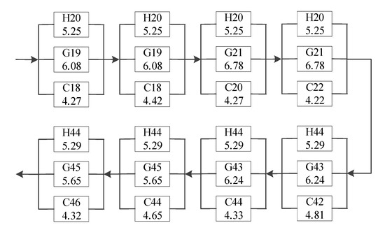 Subsequently, the system reliability of the bridge was estimated through the series-parallel connection criterion. The corresponding series-parallel relationship is presented in Figure 15. It can be observed that the system reliability index was 9.63 by considering the three-level fault tree.