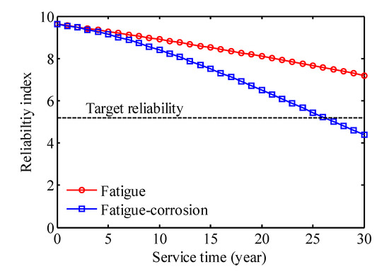 According to the standard for structural reliability of highway engineering in China, a bridge controlled by brittle failure should have a reliability index greater than 5.2. Therefore, the bridge used in the present study has an adequate safety factor during its lifetime. Nevertheless, fatigue-corrosion damage is the main factor that leads to of bridge safety degradation. In future studies, th cable strength should be determined and updated in the system reliability evaluation.