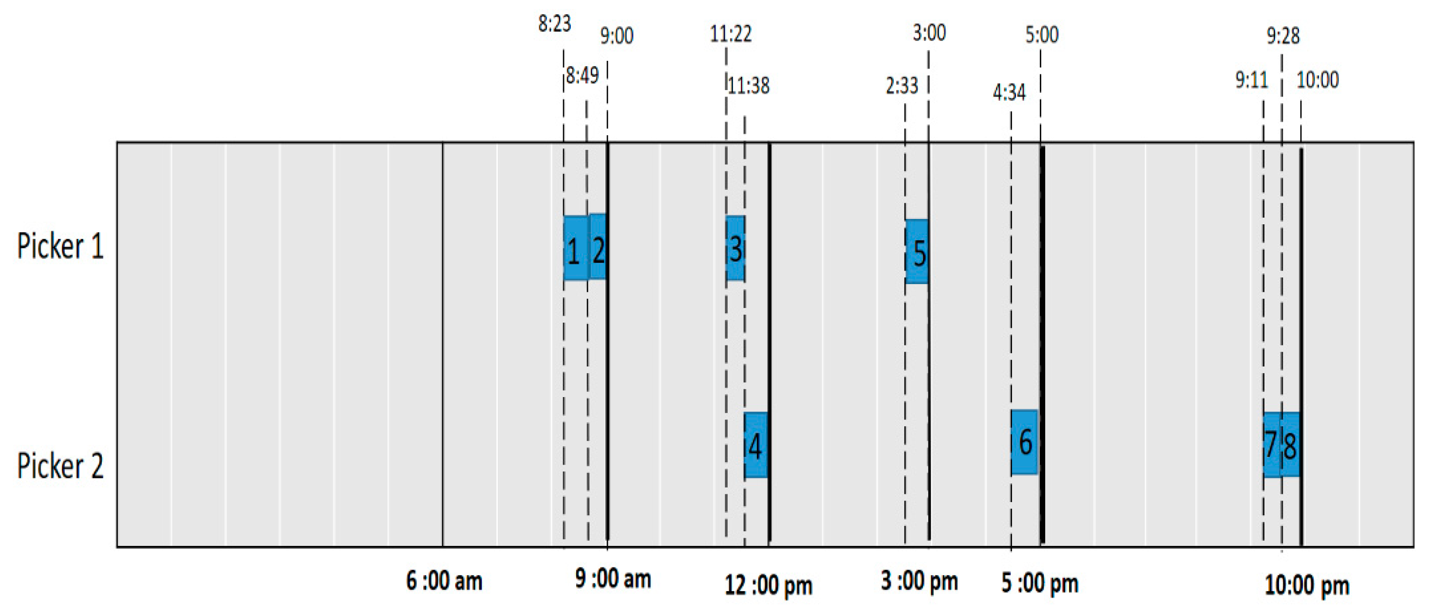 | Batch (b)/Picker (p) | Placing Order Time | Customer Order (o) | Start Time | Operation Time (min.) | Finish Time | Waiting Time | Truck Loading Time (r) |