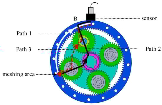 As shown in Figure 1, there are three dominate paths for vibration signals to transfer from planet-ring gear meshing area to accelerometer sensor. Vibration signal transfers to sensor directly in path 1. Undeniable, vibration signal could also transfer to sensor through the major arc, but the signal caught by sensor is much weaker apparently. In path 2, vibration signal firstly transfers to planet-sun meshing area, after transferring back to planet-ring meshing area that is closest to the sensor (as point B shown in Figure 1), vibration signal transfers to sensor eventually. Path 3 is more complicate, vibration signal transfers to planet carrier through gear body of planet gear, planet gear bearing, planet bearing shaft, after transferring back to planet-ring meshing area, which is closest to the sensor (as point B shown in Figure 1), through a reversed path, vibration signal transfers to sensor eventually. There are also other potential paths to transfer vibration signal from planet-ring meshing area to sensor, however, they are obviously much longer than the three paths mentioned above, which will result in signal attenuation gradually.