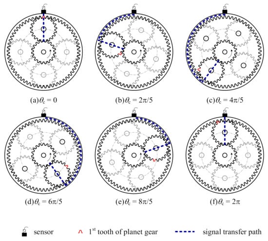 When planet gear and ring gear meshes at the sensor, as shown in Figure 2a, signal transferring path is shortest, and there will be no signal attenuation. On the contrast, when planet gear and ring gear meshes at the radial opposite position of sensor, signal transferring path is longest, and there will be the severest signal attenuation. Dynamically, as planet-ring gear meshing area departs from the sensor, which is shown in Figure 2a–c, signal transferring path will become longer and longer until planet gear and ring gear meshes at the radial opposite position of sensor. As a result, vibration signal caught by sensor will be weaker. As planet-ring gear meshing area draws near to the sensor, which is shown in Figure 2d–f, signal transferring path will become shorter and shorter until planet gear and ring gear meshes at the sensor, vibration signal caught by sensor will be stronger as well. Variation period of signal transferring path is identical with rotating period of carrier.