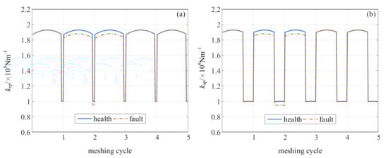 Meshing stiffness under health and fault condition: (a) ring-planet meshing and (b) sun-planet meshing.