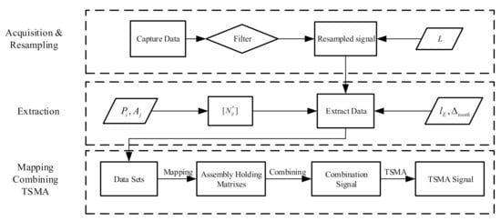Detailly, for a given planet gear, a segment of signal could be obtained by data extraction in every carrier cycle. Assuming the carrier rotates N times when collecting data, N data segments will be extracted. Since planet gear will reset to its initial state every PHTR carrier cycles, dynamic responses of planet gear could be rebuilt from consistent PHTR data segments. In this way, the extracted data segments are divided into Nset groups every PHTR cycles, where Nset = floor (N/PHTR). Then, a mapping procedure could be conducted according to the meshing regularities of planet gear, as a result, one cycle of planet gear’s dynamic response could be rebuilt from the AHM. By lining up the dynamic responses of each cycle, we can get the combination signal, and the combination signal covers Nset cycles of planet gear, instead of only one cycle in VS. At last, TSMA [45] (Time Synchronous Moving Average) algorithm is used to filter out noises and asynchronous signals while keeping signal periodicity.