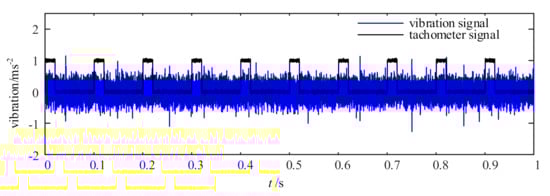 During the experiments, driving motor running speed was 1200 r/min and torque is 41.2 Nm. Accordingly, rotating speed of second stage planet carrier was 30.10 r/min. For that, 198.4 s data were collected during each test. Shown in Figure 19 is vibration and tachometer signal from 4 to 20 s collected during a test.