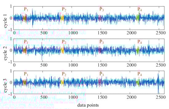 As shown in Figure 2, planet gear of interests passes the sensor once in a carrier cycle. According to analysis in Section 2.1, when the planet gear meshes with ring gear at the sensor position, sensor captured signals will be dominated by the very planet meshing. Additionally, signal of the planet gear is less influenced by planetary movements-caused modulation effects at the time. If we extract a segment of signal from the monitoring signal that corresponds to the moment when the planet gear meshes at the sensor position, the extracted signal segment mainly contains dynamic responses of the planet gear that meshes at the sensor, moreover, the extracted signal is less influenced by the modulation effect.