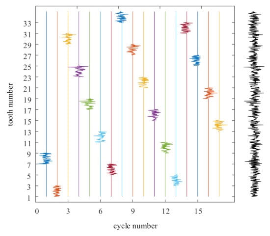 When the planet gear meshes at the sensor again after a carrier cycle, the tooth aligns with the sensor will be different. Comparing Figure 2a,f, the 1st tooth of the planet gear aligns with the sensor when θc = 0 while does not aligns with the sensor when θc = 2π. It can be easily concluded that planet gear tooth number aligns with the sensor changes periodically as planetary gearbox runs, but the detailed meshing regularity should be investigated in order to build mapping relationship between extracted signal segments and planet gear teeth.