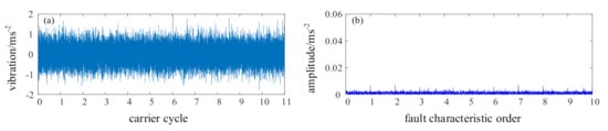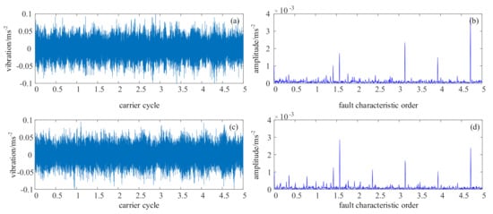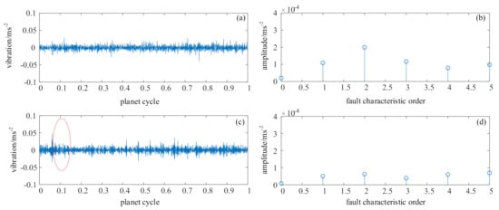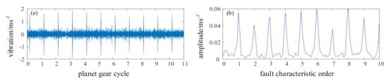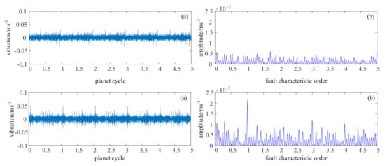Figure 21 shows the resultant signal using the proposed CVS-MED method. The collected data covers 97 full carrier cycles, and the PHTR is 17. As a result, MED signal covers 5 cycles of planet gear. Comparing with raw signal, the noises within the raw signal is effectively depressed, and unrelated frequencies are filtered out by TSMA filtering. Comparing Figure 21a,c, namely, CVS-MED signal under health and fault condition, five equally spaced impulses emerge in the CVS-MED signal when planet gear is under fault condition. The fault-induced impulses are stronger than other impulses within the signal. Moreover, amplitudes at fault characteristic order and its multiples increases significantly, which highly suggests the occurrence of planet gear fault. After processing, using the proposed CVS-MED method, planet gear fault could be diagnosed much more easily. The experimental signal processing result indicates that the CVS-MED-based method is effective to diagnose planet gear fault.
