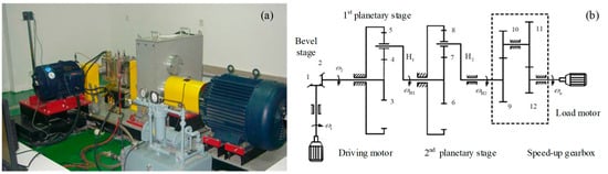 Laboratory experiments were conducted on a planetary gearbox test rig. Figure 16a,b shows its mechanical schematic. The test rig mainly includes driving motor, bevel stage, first and second planetary stage, speed-up gearbox, and load motor. Experiments can be carried out on bevel stage and two planetary stage to explore fault mechanism and response of gears; speed-up gearbox is used to match running speed and torque between driving motor and load motor. Parameters of test rig are listed in Table 3.