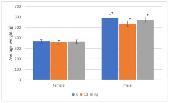 The dynamics of body weight progress was different in the Cd and Hg groups compared to the K group depending on the sex of the animals in stages (quarters). In the Cd group, the weight in individual stages was lower in both the female and male groups (except for the second quarter) than in the K group. In the Hg/male group, the weight was lower than in the K/male group during all stages. However, in Hg/female group, the weight was higher than in the K/female group from the first to the third quarter and lower in the fourth quarter. Comparing the Cd and Hg groups, the weight in the Hg group was higher than in the Cd group in both sexes. Despite these trends in weight development in the comparison of the K group and the Cd and Hg groups in the individual stages of the experiment, no statistical significance was recorded. The average weight in the female and male groups during the experiments are given in Table 1 and Table 2, respectively. At the end of the experiment (after 52 weeks), the weight of the animals in both the Cd and Hg groups was lower compared to the K group, although statistical significance was not observed. When comparing the male and female groups, the body weight was significantly higher in all the male groups than that in female groups (p < 0.001). When comparing the Cd and Hg groups, the wight of the animals was higher in Hg group than in Cd group for both males and females, although there was no statistical significance observed in the exposed and K groups. A comparison of weights is presented in Figure 1.
