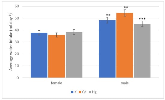 A comparison of water intake after 52 weeks of the experiment. ** p < 0.001, for K/Cd groups compared to corresponding female groups; *** p < 0.05, for Cd male group compared to Hg male group; n = 8 per group.