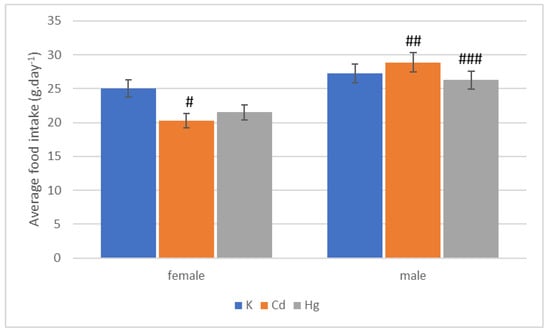 A comparison of food intake after 52 weeks of the experiment. # p < 0.05, for K female group compared to Cd female group; ## p < 0.001, for Cd female group compared to Cd male group; ### p < 0.05, for Hg female group compared to Hg male group; n = 8 per group.