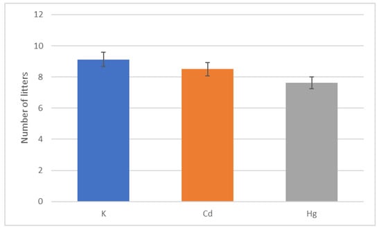 The number of litters during the 52 weeks of the experiment was lower in the Cd and Hg groups than the K group. Among the exposed groups, a higher number of litters was recorded in the Cd group than in the Hg group. However, no statistically significant difference was noticed between the groups. The average number of litters is shown in Figure 4.