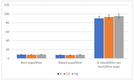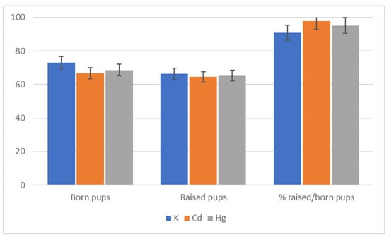 The number of born pups per litter and raised pups per litter was higher but insignificantly in the Hg group than in the K and Cd groups. The average number of born pups per litter and raised pups per litter and the percentage of raised pups per litter out of the total born pups per litter is presented in Figure 6.