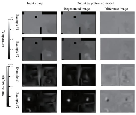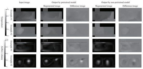 As shown in Table 2, the MAEs of temperature from the model with and without pretraining were and , respectively. the MAEs of airflow volume are and m3/min, respectively. The processing time for 100 sets of images was 36.54 s, where the specifications of the computer for this processing are Ubuntu 16.04, Intel(R) Xeon(R) E5-2640 v4 2.40 GHz, 256GB DDR4, and NVIDIA GeForce GTX 1080 Ti. We believe the processing speed is enough to manage actual air conditioning in real time.