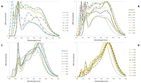 Spectral power distributions of LEDs divided by Correlated Color Temperature (CCT). (A) >5001 K series, (B) 4001–5000 K series, (C) 3001–4000 K series, and (D) <3000 K series.