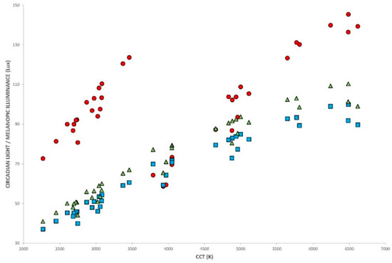 ○ CLA, circadian light; □ CIE (EDI) and Δ WELL(EML), melanopic illuminance as a function of the CCT.