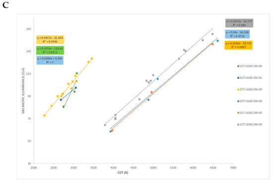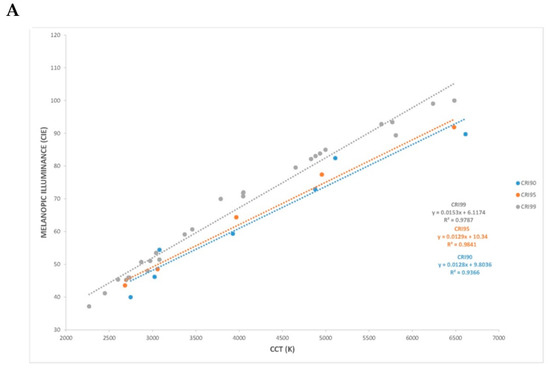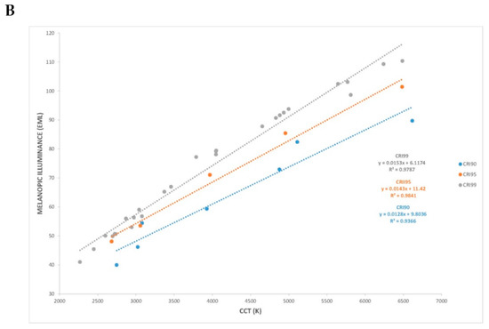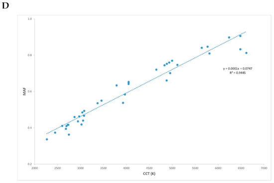 Regarding CCT, it has been determined that for the same CCT and equal photopic illuminance (100 lux), in general terms EDI and EML linearly increase with an increase in CRI (Figure 3). The same behavior can be observed in the Rea metric, particularly at higher CCTs. At lower CCTs, it is more difficult to determine a fixed rule, perhaps because of the low number of LEDs evaluated with CRI90 and CRI95. These characteristics are often observed. However, each lamp must be analyzed in detail, not only by CCT or CRI but also by its SPD. The MAF calculated with Equation (4) has a linear relationship with CCT, and it seems that the two well-correlated parameters can be used as references for the properties of the LEDs.