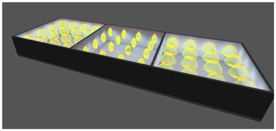 This section describes the detailed parameters used in several lighting simulations visualized using the 3D modelling software program Dialux-EVO. Three virtual rooms measuring 10 m wide × 10 m deep × 2.80 m high were designed, and luminaires with regulation and different spectral distribution curves were chosen for each room: Lambertian (beam spread 120°), intensive (beam spread 54°), and extensive (beam spread 90°), (Figure 4).