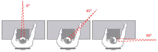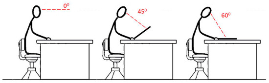 In another step, a more realistic scenario has been added. That is, the dynamic situation has been completed with a rotation with respect to a horizontal axis passing through the corneal vertex (120 cm from the floor), simulating a reading position (Figure 6). To avoid excessive and repetitive simulations, two limit values of reflectance in the work plane (76 cm from the floor) are considered (Table 5). The reflectance of the surfaces that is observed by a subject influences the illuminance at the eye level. Not only the reflectance of the wall or ceiling can elevate or diminish the amount of the light that reaches the corneal surface. To perform a more accurate simulation, the time that a subject spends looking in each position could be analyzed with an eye tracker. This approach could be useful to analyze realistic exposition times during working time.