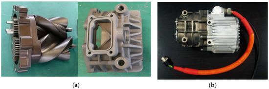 The Roots pump investigated in this study is in a three-lobe configuration with helical rotors, and it is developed specifically for a fuel cell system output power range from 60 to 110 kW. The pump is also required to operate steadily when the load of the fuel cell is down to 25%. The design parameters of the Roots pump are listed in Table 1 and the main parts are shown in Figure 2.