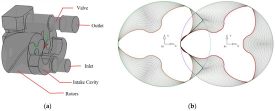 Simulation model of the Roots pump: (a) fluid domain; (b) rotor grids.