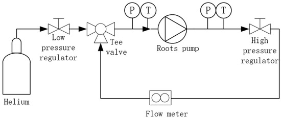 As mentioned in Section 3.1, the Roots pump studied has been tested extensively under various operating conditions. The experimental tests were built to calibrate and validate the results simulated by the CFD model established. The experimental test with working fluids of the helium and air were used instead of hydrogen for the sake of safety. The schematic diagram of the experimental test rig is shown in Figure 4. It should be noted that the supplied air was suctioned by the Roots pump from the environment when the working fluid is air. As seen in Figure 4, the fresh helium was supplied by a helium tank at the start-up stage of the experimental test. Then, the helium supply could be cut off by a tee valve, and the helium recirculation was performed to recycle the supplied helium. The low- and high-pressure regulators were used to adjust the inlet and outlet pressure of the Roots pump, respectively. The flow rate of helium recirculation was measured by a Coriolis mass flow meter with a maximum range of 1000 L/min and an uncertainty of 0.8%. The pressure and temperature of Roots pump inlet and outlet were measured by the pressure and temperature sensors, respectively.