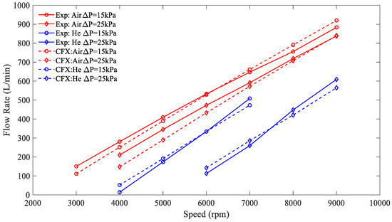 The suction temperature of the air and helium is 30 °C and the suction pressure of the helium is 200 kPa, while that of the air is the ambient pressure. As shown in Figure 5, the flow rate simulated for helium with a speed of 6000 rpm and pressure difference of 15 kPa is calibrated by changing the clearances within the Roots pump to have the error as small as possible between the data measured and that simulated. Then, all the volume flow rates under other operating conditions are simulated and validated based on these clearances adjusted as above. Except for the clearance at the discharge end, which is 0.15 mm, the values of other clearances are all of 0.1 mm for the clearance between the rotors, the clearance between the rotor tip and the casing as well as the clearance between the rotor end face and the casing at the suction end. The values of 0.1 mm and 0.15 mm are the normally applied clearances in most commercially available roots pumps.