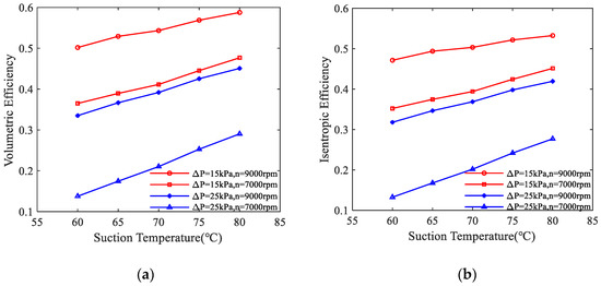 A similar pattern to volumetric efficiency can also be found in isentropic efficiency between suction temperatures in Figure 6b. The difference is that the change of the isentropic efficiency with the temperature is slightly smaller than that of the volumetric efficiency. For example, when the pressure difference is 15 KPa and the rotation speed is 9000 rpm, the volumetric efficiency of the Roots pump is improved by 9% from 50% to 59%, while the isentropic efficiency is improved by 6% from 47% to 53% with the increasing of suction temperature from 60 °C to 80 °C. Similarly, this could also be caused by reduced leakage, which means reduced internal energy loss.