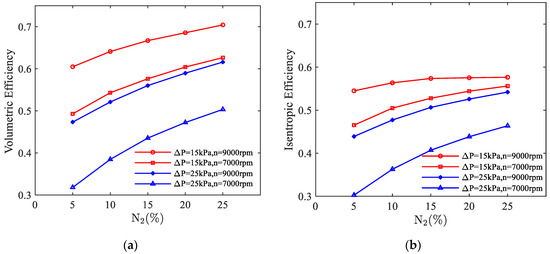Effect of nitrogen on the performance: (a) volumetric efficiency; (b) isentropic efficiency.
