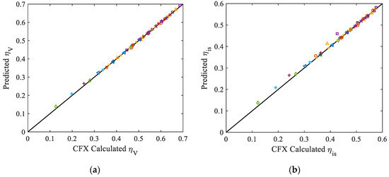 As shown in Figure 9, these two correlation equations can achieve high accuracy within the range of pressure difference of 15–25 kPa, a temperature of 70–80 °C, a rotation speed of 5000–9000 rpm and a nitrogen mole fraction of 5–25%. In most cases, the absolute error of the predicted value of volumetric efficiency did not exceed 1%, which could precisely reflect the influence of the four factors on volumetric efficiency. Although most of coefficients in the correlation equation are fitted at a speed of 7000 and a pressure difference of 25 kPa, we can see from Figure 9 that high accuracy can still be ensured at different speeds and pressure differences, which suggests that the assumption about correlation equation is feasible. Through these two correlations, the volumetric efficiency and isentropic efficiency of the Roots blower can be quickly estimated as the four factors change.