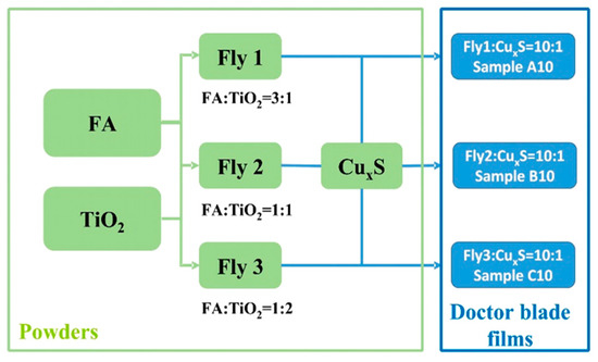 In the preparation process, the FA–TiO2 and copper sulfide powders were mixed. A schematic diagram was used to explain the preparation method (see Figure 1). Mixing the constituents with ethanol in a weight ratio of 5:1:8, a paste was obtained. The paste was smeared on a microscopy glass substrate (sample of 1.5 × 2.5 cm2) which was previously cleaned using ethanol, distilled water, and acetone in continuous sonication process. After drying in the air for about 30 min, the films were annealed in an oven at 300 °C for 1 h.