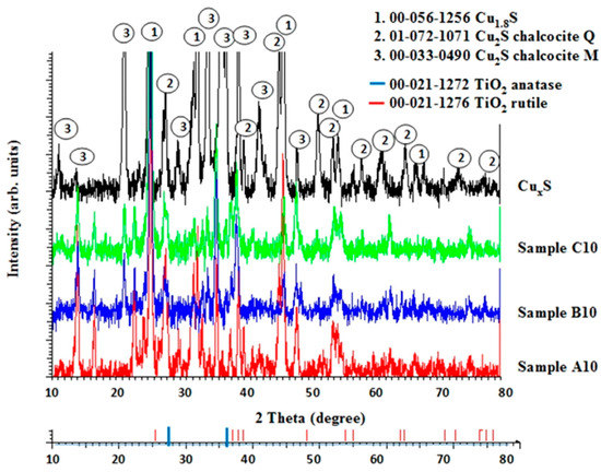 X-ray diffraction (XRD) patterns for ternary TiO2–CuxS–FA heterostructures.