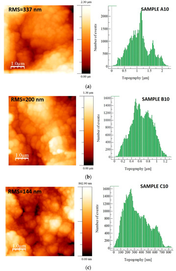 The morphology is an important property that can influence both photocatalytic efficiency and adsorption that take place at the heterostructure’s interface with the working environment. The AFM images presented in Figure 3 show that meso- and micro-particles are agglomerated in large aggregates depending on the heterostructure composition.