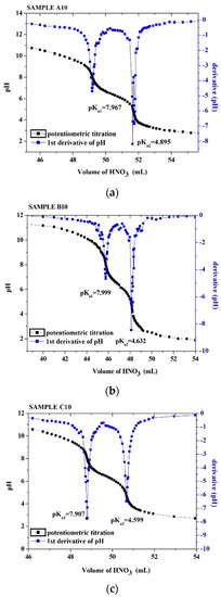 pH changes in the photocatalyst films vs. total HNO3 0.1M volume (black line) and the derivative curve (dpH/dV, blue line), (a). sample A10, (b). sample B10, (c). sample C10.
