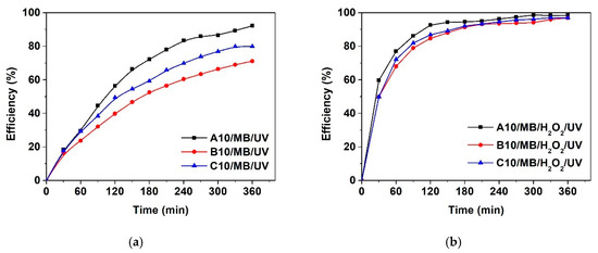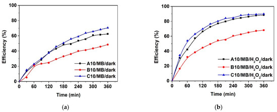 The main oxides present in fly ash are mullite (2SiO2∙3Al2O3), α-quartz (SiO2), hematite (α-Fe2O3), and magnetite (Fe3O4), which comprise over 70% of the fly ash. The majority of oxides present in fly ash are photocatalytic inactive; fly ash is a good adsorbent in dye removal. The magnetite and hematite, together with hydrogen peroxide, act as in situ Fenton reactive, which improves the efficiency of dyes degradation. The results presented in Figure 6b and Figure 7b demonstrate that in situ Fenton and photo-Fenton homogeneous processes, caused by the Fe2+, Mn3+ and Cu2+, on the surface of the fly-ash-based material increase the MB degradation very quickly. Under UV irradiation, the effect of H2O2 is much stronger, and the efficiency strongly increases, suggesting these materials be recommended for wastewater remediation.