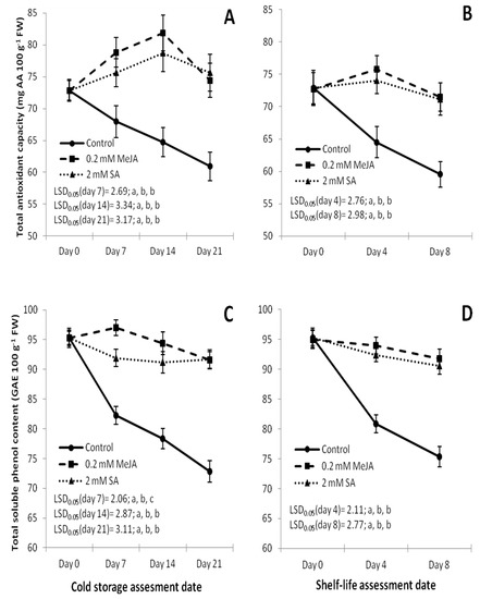 The content of TSP was similar in the MeJA and SA treatments in both storage treatments, while the TSP content of control fruits decreased continuously in both treatments (Figure 1C,D). The TSP content was higher in the treatments of MeJA and SA at p < 0.05 compared to the control treatment in both storage treatments (Figure 1C,D).