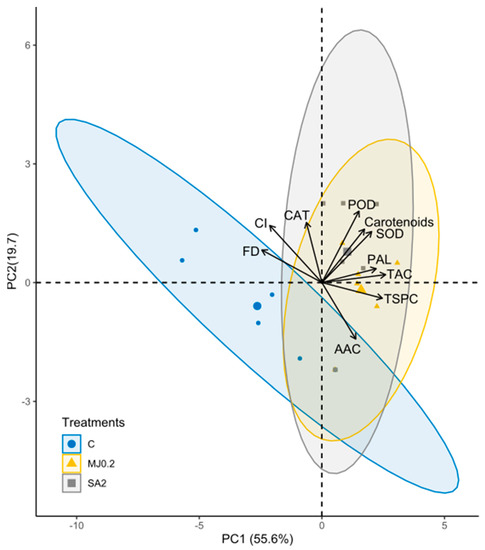 Biplot of principal component analyses (PCA) conducted on the measured fruit quality parameters: CI = chilling injury index, FD = fruit decay index, CAT = catalyse activity, SOD = superoxide dismutase activity, POD = peroxidase activity, PAL = phenylalanine ammonia-lyase activity, AAC = ascorbic acid content, Carotenoids = total carotenoid content, TSPC = total soluble phenol content and TAC = total antioxidant capacity. (C: control; MJ0.2: MeJA, 0.2 mmol L−1; SA2: SA, 2 mmol L−1); 95% ellipses).