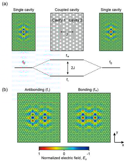 Figure 1a shows the eigen-frequency relation between the single component cavity and the doubly coupled cavity: the eigenfrequency f0 of the single component cavity is split into two eigenfrequencies, f+ and f–, of the doubly coupled cavity with a frequency difference of 2J, based on Equation (2). Equation (2) reveals that the rational design of two component cavities with controllable J can allow for the systematic tuning of eigenmodes and the corresponding eigenfrequencies in the coupled PhC cavity. Henceforth, we focus on controlling J while maintaining the structural parameters of the component cavities. As the L3 line defect PhC cavity supports a high-quality (high-Q) fundamental mode with strong light confinement near the cavity, alterations of the cavity structure can introduce undesirable complexities, which may lead to a considerable optical loss.