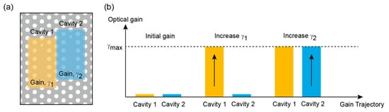 Rationally designed photonic crystal (PhC) nanostructures have accelerated the development of various optical devices, such as low-loss optical waveguides, wavelength-selective filters, high-speed modulators, and low-threshold ultra-small nano-lasers [1,2,3,4]. In such devices, the PhC nanostructures take advantage of the photonic bandgap, which prohibits the propagation of photons with certain frequencies, thereby serving as excellent light reflectors and mirrors. In particular, wavelength-scale PhC defect nano-cavities, which support resonant optical modes with high-quality factors, efficiently confine photons into an extremely small physical volume. Furthermore, they have enabled the development of chip-scale photon sources. Moreover, they have facilitated studies on intriguing quantum photonic phenomena, such as quantum phase transitions in cavity quantum electrodynamics [5,6,7,8,9]. In this regard, the application of the quantum mechanical concept of parity–time (PT) symmetry to a coupled optical cavity system has drawn increasing attention; this is because unprecedented lasing operations have been successfully demonstrated using such a system [10,11,12,13,14,15,16]. Particularly, the authors of [15] systematically controlled the spatially asymmetric optical gain in a coupled PhC defect nano-cavity system by introducing absorptive nanomaterials, e.g., graphene, and enabled the realization of non-Hermitian lasing actions in unbroken and broken PT-symmetric phases and the unique non-Hermitian phase transition at exceptional points (EPs). Furthermore, they identified and accurately analyzed lasing modes and the corresponding non-Hermitian behaviors using a PhC defect nano-cavity that exhibits only a few resonant optical modes with a wide free spectral range within a given optical gain frequency range. However, despite numerous merits, the potential of PhC nano-cavities for non-Hermiticity control has not been explored sufficiently, suggesting that rational design and cavity engineering can facilitate the development of new non-Hermitian photon sources.