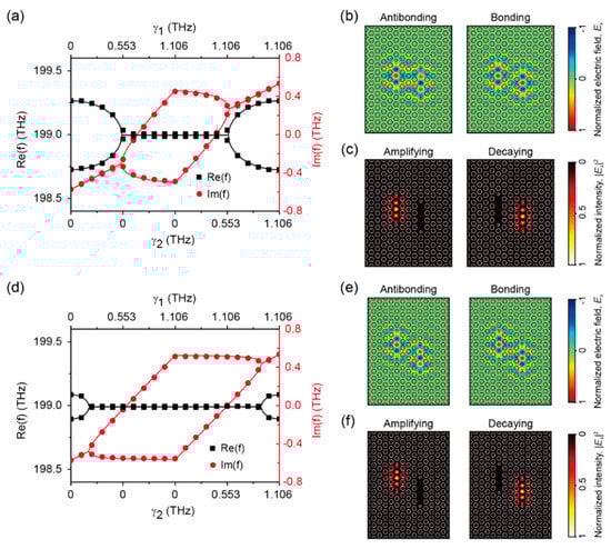 Figure 4 shows the results. First, we employed the doubly coupled PhC cavity without performing vertical airhole shifting and calculated the real (Re(f), black squares) and imaginary parts (Im(f), red circles) of the complex eigenfrequencies as a function of the gain trajectory presented in Figure 3b and Figure 4a. Analytical solutions (black and red lines) obtained from Equation (4) were co-plotted, and they agree well with the numerical simulations. The model parameters such as Δγ, γavg, κ, and J were obtained from the numerical simulations by fitting them with Equation (4). The results clearly reveal the unique non-Hermiticity nature, exhibiting the evolution of the state from the unbroken to the broken PT-symmetric phase and vice versa with phase transitions occurring at the EPs. For example, the real part of the eigenfrequencies, Re(f), shows two distinct eigenmodes (i.e., bonding (Re(f+)) and antibonding (Re(f−)) modes) at Δγ = 0, as expected from Equation (4). As |Δγ| increases, the eigenfrequency difference between Re(f+) and Re(f−) reduces, and the system is in the unbroken PT symmetry phase. At the EP with |Δγ| = 0.345 THz, which is equal to J, the two eigenmodes coalesce and become a single degenerate eigenmode. As |Δγ| further increases, the system enters the broken PT-symmetric phase, and the degenerate eigenmode holds until |Δγ| = 1.106 THz. In contrast, the imaginary part of the eigenfrequencies, Im(f), exhibits an opposite development. Im(f) of two eigenmodes are both equal to each other when |Δγ| < 0.345 THz, which indicates that the two eigenmodes experience an equal amount of optical gain. However, at |Δγ | values larger than that at the EP, Im(f) is bifurcated, independently contributing to the two degenerate eigenmodes. Consequently, the degenerate eigenmodes are classified into two kinds of eigenmodes that experience positive (amplifying mode) and negative (decaying mode) optical gain. The maximum bifurcation of Im(f) is obtained when |Δγ| = |Δγ|max (i.e., 1.106 THz). Figure 4b,c shows the field and intensity profiles of the eigenmodes in the unbroken and broken PT-symmetric phases. Figure 4b shows the field distributions of the out-of-phase antibonding and in-phase bonding modes at γ1 = γ2 = γmax. As |Δγ| increases, these field distributions slowly alter in response to the relative magnitude of γ1 and γ2. For example, at optical gains of γ1 = γmax and γ2 = 0, the fields are confined exclusively in cavity 1 for the amplifying mode and in cavity 2 for the decaying mode (Figure 4c). This unique non-Hermitian behavior can be exploited in experiments to help develop a new active tuning mechanism, without altering the cavity structure, that enables dramatic changes in terms of resonant frequency and field profile. In laser applications, for example, one can readily excite two eigenmodes (e.g., bonding and antibonding modes) with slightly asymmetric pumping and judiciously induce an unbalanced modal competition that favorably acts on one of the eigenmodes, resulting in the final laser mode [8,17,18]. In addition, one can exclusively excite a single amplifying laser mode by applying for the further increased levels of the asymmetry.