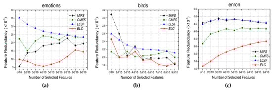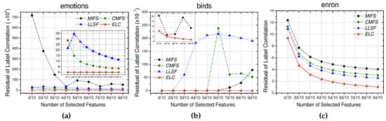 Similarly to the configuration in Section 5.2, we take emotions, birds, and enron as the benchmarks and record of the features selected by each approach, where . As shown in Figure 2, ELC is better at preserving the class correlation information than the other multi-label feature selection approaches. Actually, the majority of the existing multi-label feature selection approaches take the label correlation information into consideration to some extent. In contrast to these approaches, ELC quantitatively measures this correlation information and maximally embeds it into the feature selection process. This characteristic, which has already been proved in Property 2, can be further revealed by the experimental results in this section.