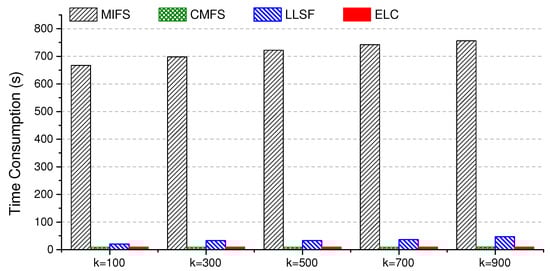 In this section, we compare the approaches in terms of their feature selection efficiency. The time consumption here merely records the feature selection time, excluding the classification cost. All of the tests were implemented in Matlab on an Intel Core i7-4790 CPU (@3.6GHz) with 32GB memory (Intel Corp., Santa Clara, CA, USA). We respectively selected () features on the enron dataset and recorded the time consumption of each compared approach. As illustrated in Figure 3, ELC and CMFS are comparably efficient to converge, while MIFS is most time-consuming, which may be mainly attributed to its involved label clustering process.