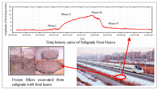 In recent years, Northeast China’s high-speed railway has entered a period of large-scale development [1], with the operating mileage over 2000 km, the majority of which covers seasonally frozen ground [2]. Field tests (shown in Figure 1) demonstrated that the water in the surface layer of the bed is frozen in winter, which makes subgrade heave [3]. The operation experience of the Harbin-Dalian high-speed railway shows that subgrade frost heave makes it difficult to maintain the stability and safety of vehicles [4,5,6,7]. Specifically, subgrade frost heave causes deformation of rails, which deteriorates the regularity state of the track system [8] and increases the dynamic response of wheels and rails. Then, both the deformation from the subgrade and the increased dynamic response aggravate the structural damage, which further affects the operation state of the whole system. To accurately evaluate the service state of high-speed railways in cold regions, it is necessary to clarify the influences of frost heave on the vehicle-track system [9,10,11].