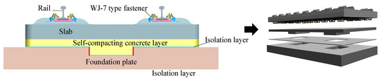 CRTS Ⅲ slab track is a two-dimensional prestressing slab track, independently developed by China, which has been applied in high-speed railways in cold regions. The track system consists of rails, WJ 7 type fasteners, the slab, the self-compacting concrete layer, the isolation layer made by geotextile and the foundation plate (shown in Figure 3) [40]. The slab track model is modelled by ABAQUS (v. 6.14, Dassault Systems, Vélizy-Villacoublay, France). The fasteners were simulated by a connector element which contained stiffness and damps in three directions; the isolation layer was treated as contact elements which only provided compressive stress, with a friction coefficient of 0.5 in the tangential direction; other components were simulated by solid elements [41,42]. As a filling layer, the self-compacting concrete layer was reinforced by u-shaped steels; thus, the interface between the slab and the self-compacting concrete layer was considered to be in a superior bonding state. Cooperating with the filling layer, two concave grooves (shown in Figure 3) were provided on the foundation plate to act as a limiting structure, and a contact stiffness was given to simulate the cushion inside the grooves [43]. Moreover, there were two slabs placed on one foundation plate. The structure parameters of the CRTS Ⅲ slab track are shown in Table 2.